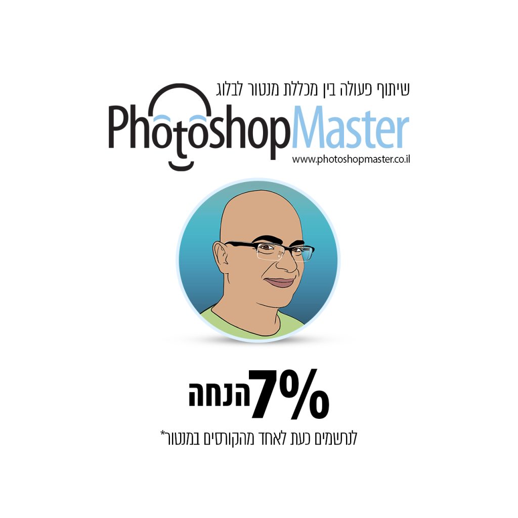 מנטור, המכללה המקצועית ביותר בארץ בשיתוף פעולה ייחודי עם בלוג PhotoshopMaster של יגאל לוי. גולשי האתר יוכלו ליהנות מהנחה של 7% על כל הקורסים ומסלולי הלימוד במנטור, : החל מקורסי הצילום (מתחילים ומתקדמים), המשך בקורסי עריכת הוידאו, בינה מלאכותית למעצבים, קורס Adobe Master, מסלול עיצוב לדיגיטל (Ux/Ui) ועוד…